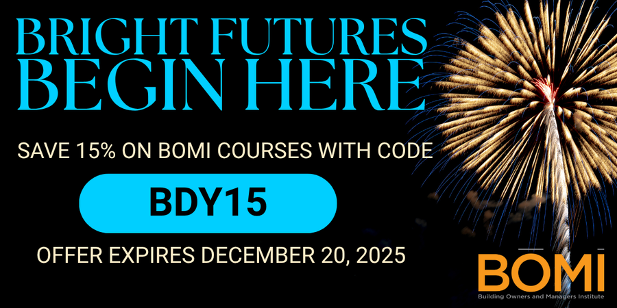 From November 24 to December 20, BOMI is offering its Best Deal of the Year — 15% off full-length online self-paced courses and 15% off the first two collaborative virtual learning courses of 2026*. |