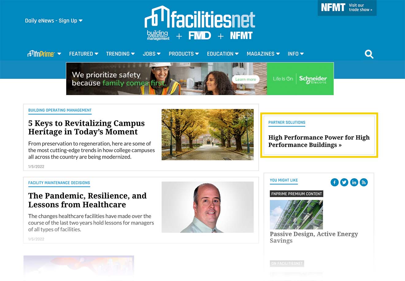 FacilitiesNet.com is the go-to site for online news, reports, career development, products and insights on facilities management. If you want today's facility executive to be aware of you, this is the place to be. It's also the online home for Building Operating Management and Facility Maintenance Decisions magazines, as well as the digital counterpart for the NFMT family of trade shows.