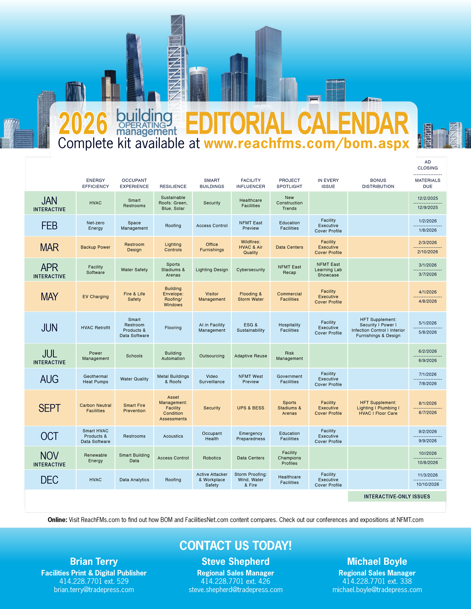 Building Operating Management magazine circulates to a 100% qualified list of 60,000 building owners and facilities executives. Our subscribers are engaged, motivated and manage multi million-dollar budgets. They are the movers and shakers in the industry. When you advertise with Building Operating Management, you reach and influence these types of high‐ranking, influential readers.