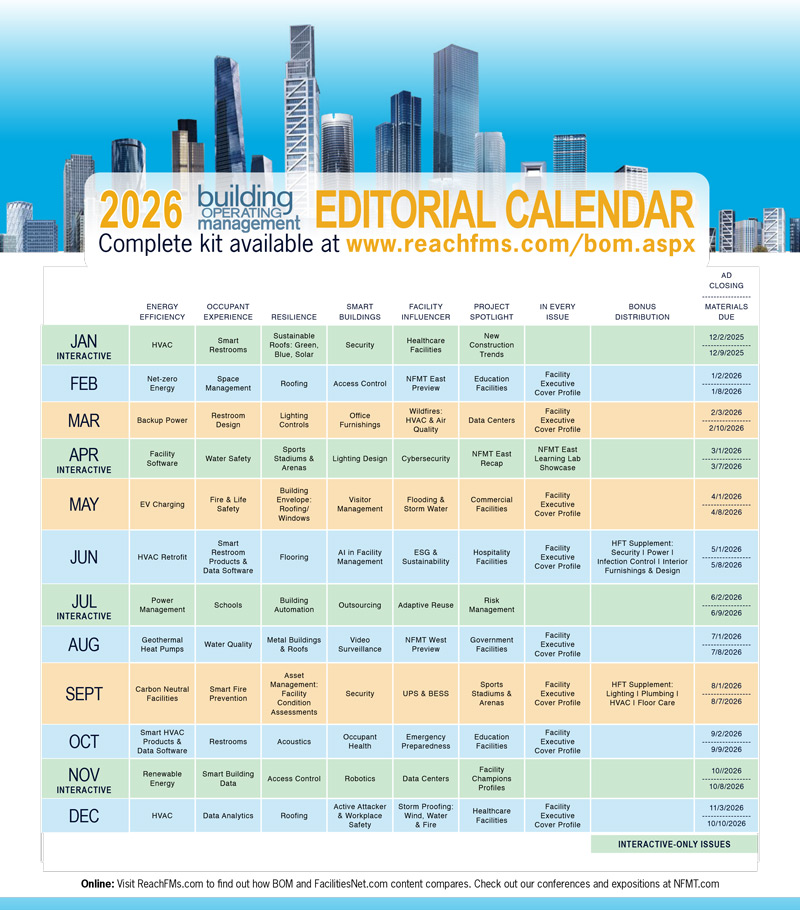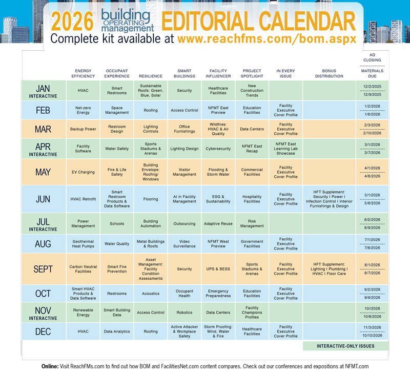 Building Operating Management magazine circulates to a 100% qualified list of 60,000 building owners and facilities executives. Our subscribers are engaged, motivated and manage multi million-dollar budgets. They are the movers and shakers in the industry. When you advertise with Building Operating Management, you reach and influence these types of high‐ranking, influential readers.